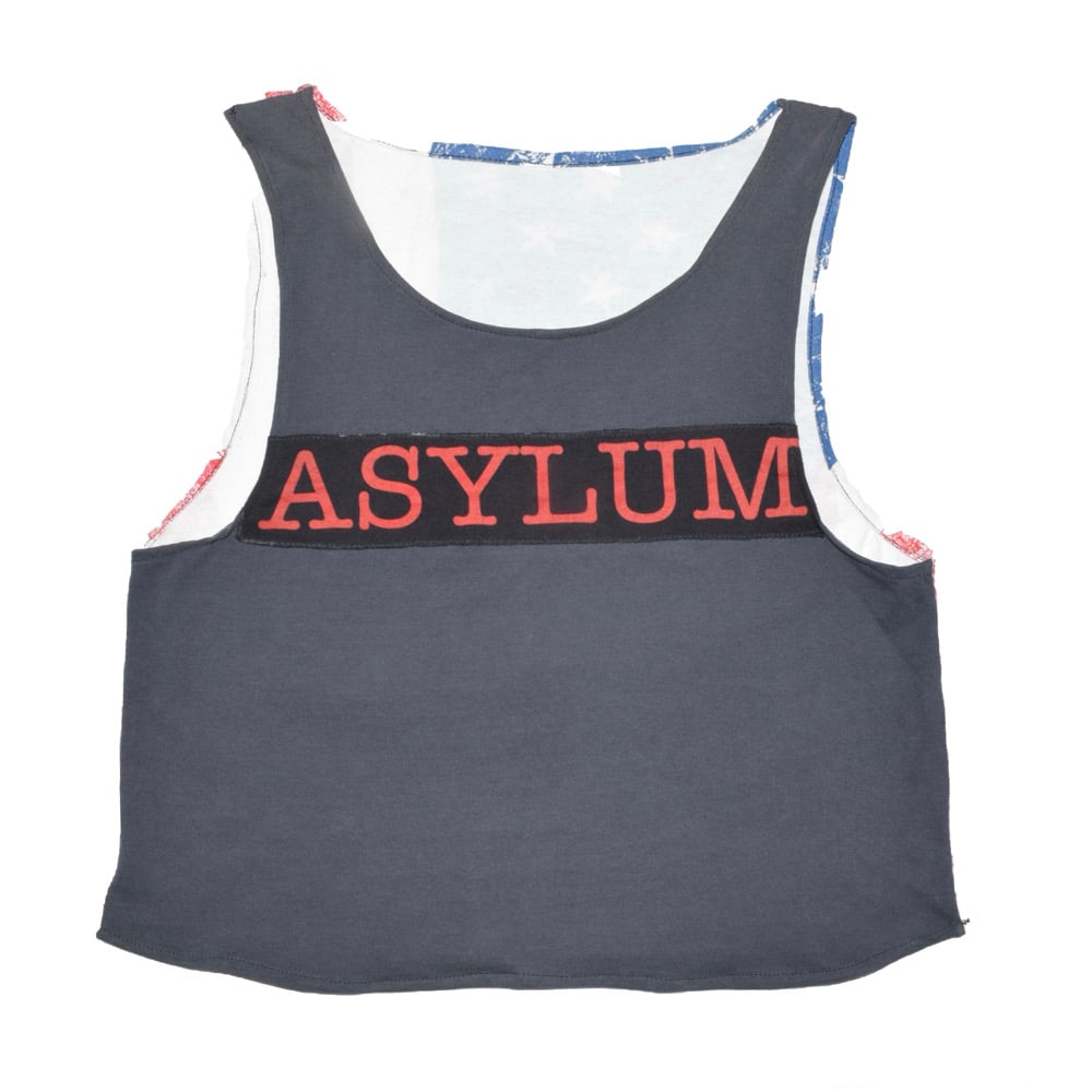 Reconstructed tees for a slight cropped tank top with “ASYLUM” patch sewn on front.