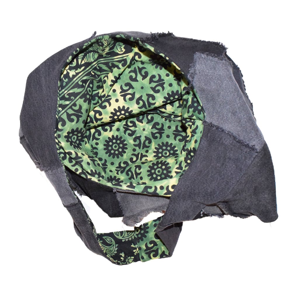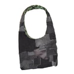Made from various black denim patches and black leather scraps, fully lined with green tapestry, hobo style bag.