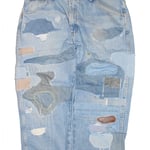 Distressed and patch worked vintage denim, hand sewn and traditional repairs throughout, open hems for extra length.
